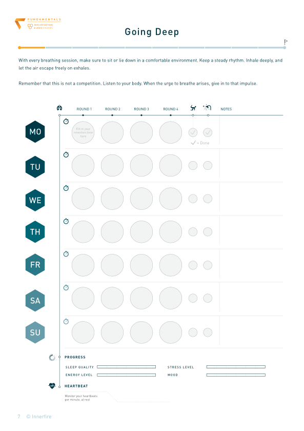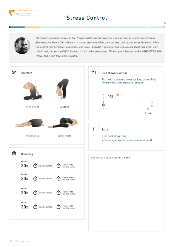 Ke kur­zu Wim Hofo­vy meto­dy „Fun­da­men­tals“ je k dis­po­zi­ci parád­ní pra­cov­ní sešit ve for­má­tu PDF. Kurz je roz­dě­len na 10 týd­nů, v pra­xi se ale čas­to 1 týden opa­ku­je něko­li­krát a po dob­rém zvlád­nu­tí se pře­jde na dal­ší týden. V kaž­dém týd­nu je tře­ba se nejdřív podí­vat na video lek­ci se sku­pi­nou, potom na pro­ta­ho­va­cí cvi­ky, video s domá­cím úko­lem, pří­pad­ně video s prů­vod­cem, kte­rý vede dýcha­cí cvi­ky. Kaž­dý týden se ode­mkne dal­ší sada videí. Pra­cov­ní sešit pomá­há sle­do­vat pokrok. Sešit opět upo­zor­ňu­je, jak je důle­ži­té nedě­lat nic na sílu, např. při zadr­že­ní dechu se opět nadech­nout, když si o to tělo řek­ne. Sešit umož­ňu­je zapsat si cíle a udr­žet si tak moti­va­ci. Dále před­klá­dá v písem­né a gra­fic­ké podo­bě cíle na kaž­dý týden a umož­ňu­je si cíle „odškrt­nout“ a udě­lat si poznám­ky. Sešit je skvě­le zpra­co­va­ný, jedi­né co lze vytknout, je že z něko­li­ka pro­ta­ho­va­cích cvi­ků jsou v seši­tě zakres­le­né jen 2 a stu­dent se tak musí pořád dívat na video, což něko­mu vyho­vu­je, ale pro něko­ho to zase zna­me­ná men­ší sou­stře­dě­ní, neboť lek­tor­ka má pro­slu­lý vemlou­va­vý „medo­vý“ hlá­sek, kte­rý někte­ří tak milu­jí a jiní tak nesná­ší. Najde­me také roz­po­ry mezi videi a domá­cí­mi úko­ly (tedy i seši­tem). Napří­klad ve sku­pi­no­vé lek­ci se vysvět­lu­je 15 cvi­ků, ale za domá­cí úkol je jich jen pět. Video říká: zadr­žet dech na 1 minu­tu, sešit říká zadr­žet ho na 1 a půl minu­ty. Dále uvá­dí­me ukáz­ku obsa­hu jed­no­ho týd­ne (prv­ní­ho).